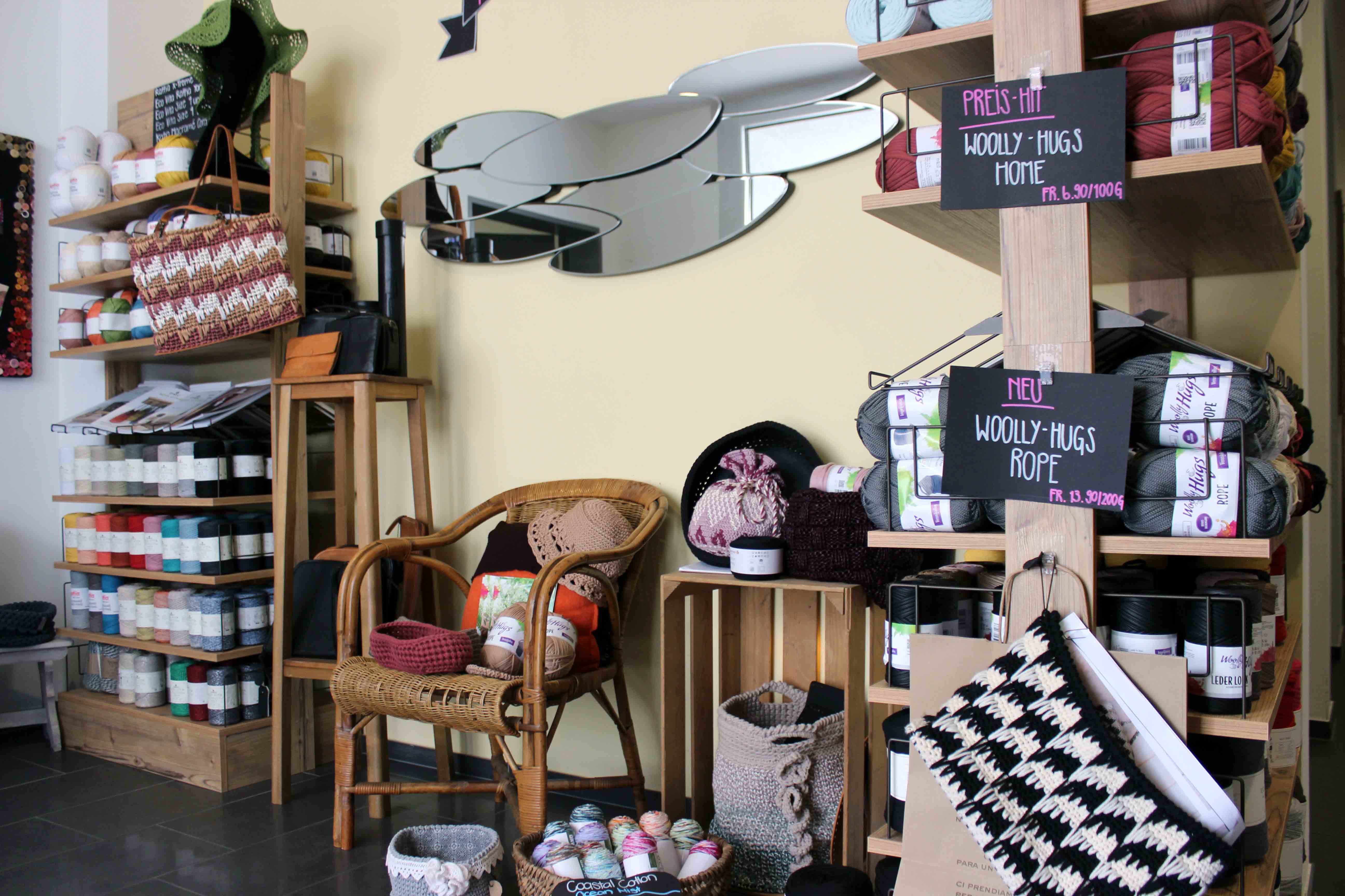 Wenn Sie den ersten Stock unseres Ladenlokals betreten, sind Sie in unserem Strickhimmel angekommen. Garne aus Seide, Kaschmir oder Baumwolle warten in den Regalen der Wollhalla darauf, zu einzigartigen Strick- oder Häkelmodellen verarbeitet zu werden. Fühlen Sie unsere hochwertigen Materialien, freuen Sie sich über die Farbenvielfalt und lassen Sie sich von den Anleitungen inspirieren. Bei uns bleiben Sie ausserdem auf dem Laufenden: Wir präsentieren Ihnen in unserer Wollhalla immer die neusten Techniken, Schnitte und Farbtrends aus der Modewelt. Im Eingangsbereich unserer Wollhalla liefern wie Ihnen ausserdem zahlreiche Ideen für Accessoires wie Taschen und für ein gemütliches Zuhause. Fertigen Sie Ihre Home-Deko selber an und gestalten Sie Ihre Teppiche, Kissen und Körben nach Ihren eigenen Wünschen und Vorstellungen. Zudem finden Sie in der Wollhalla eine grosse Auswahl an Strick- und Häkelzubehör. Von Nadeln in allen Varianten und Grössen bis hin zu Markierungsringen, hochwertige Projektbeuteln oder Massbändern.